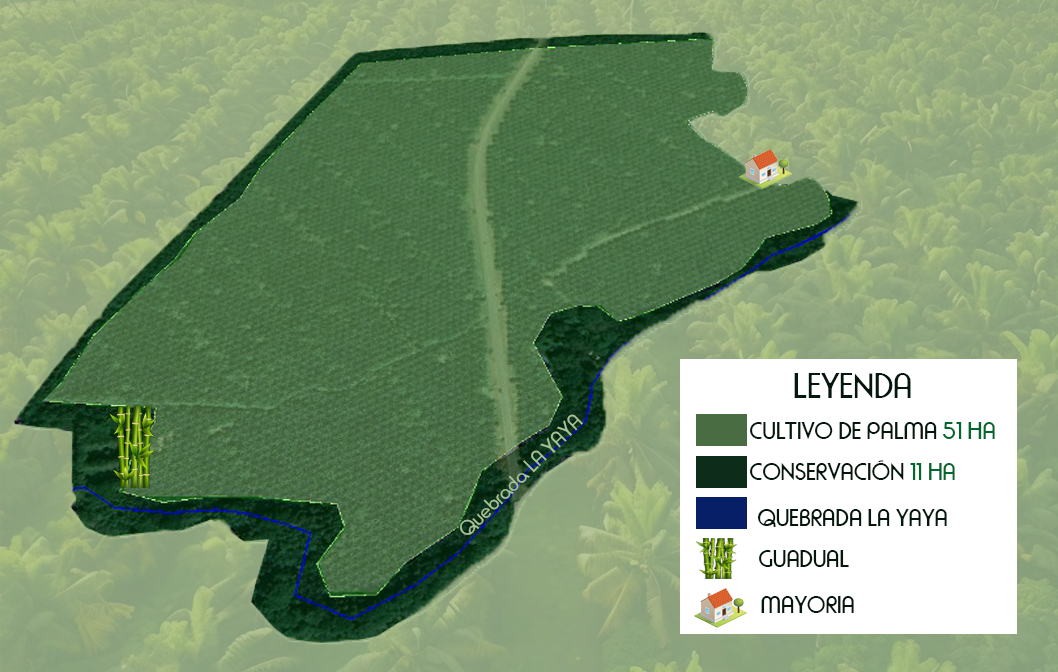 Este mapa representa la distribución del predio "La Playa", en el cual se integran de forma armónica la producción agroindustrial y la conservación ambiental. Con un área total de 62 hectáreas, se destacan 51 hectáreas dedicadas al cultivo de palma de aceite y 11 hectáreas destinadas a conservación, protegiendo la biodiversidad local. La quebrada La Yaya atraviesa parte del terreno, aportando riqueza hídrica y conectividad ecológica. Además, se identifica un guadual estratégico y la ubicación de la mayoría, centro de operaciones de la finca. Este equilibrio demuestra el compromiso con una gestión sostenible y responsable del territorio.