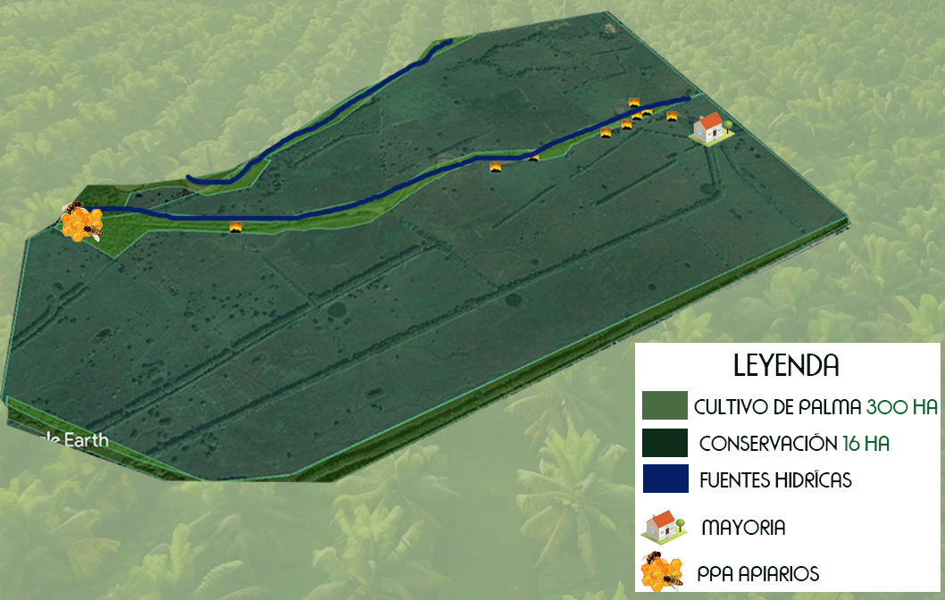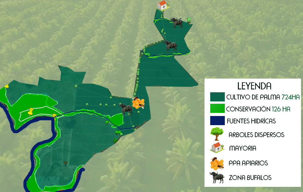 El predio "La Plana" refleja una planificación integral del territorio que equilibra la producción agrícola con la sostenibilidad ambiental. En sus 850 hectáreas, se destacan 724 hectáreas cultivadas con palma de aceite, mientras que 126 hectáreas se destinan a conservación, protegiendo fuentes hídricas, zonas ribereñas y ecosistemas estratégicos. El área cuenta con árboles dispersos que fomentan la biodiversidad, un sistema apícola (PPA Apiarios) que contribuye a la polinización natural, una zona exclusiva para búfalos que fortalece el sistema agroecológico y la infraestructura de la mayoría como eje administrativo.